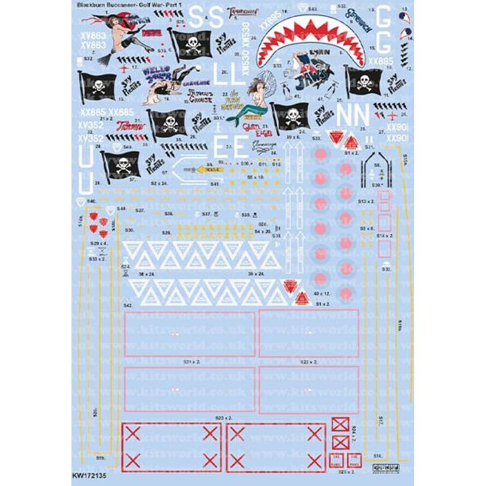 Gulf War Blackburn Buccaneers 1991. Includes 6 aircraft from Operation Granby. Sky Pirates flags, Scotch Whiskey names, nose art serials and codes and stencilling where appropriate. All desert pink camouflage.