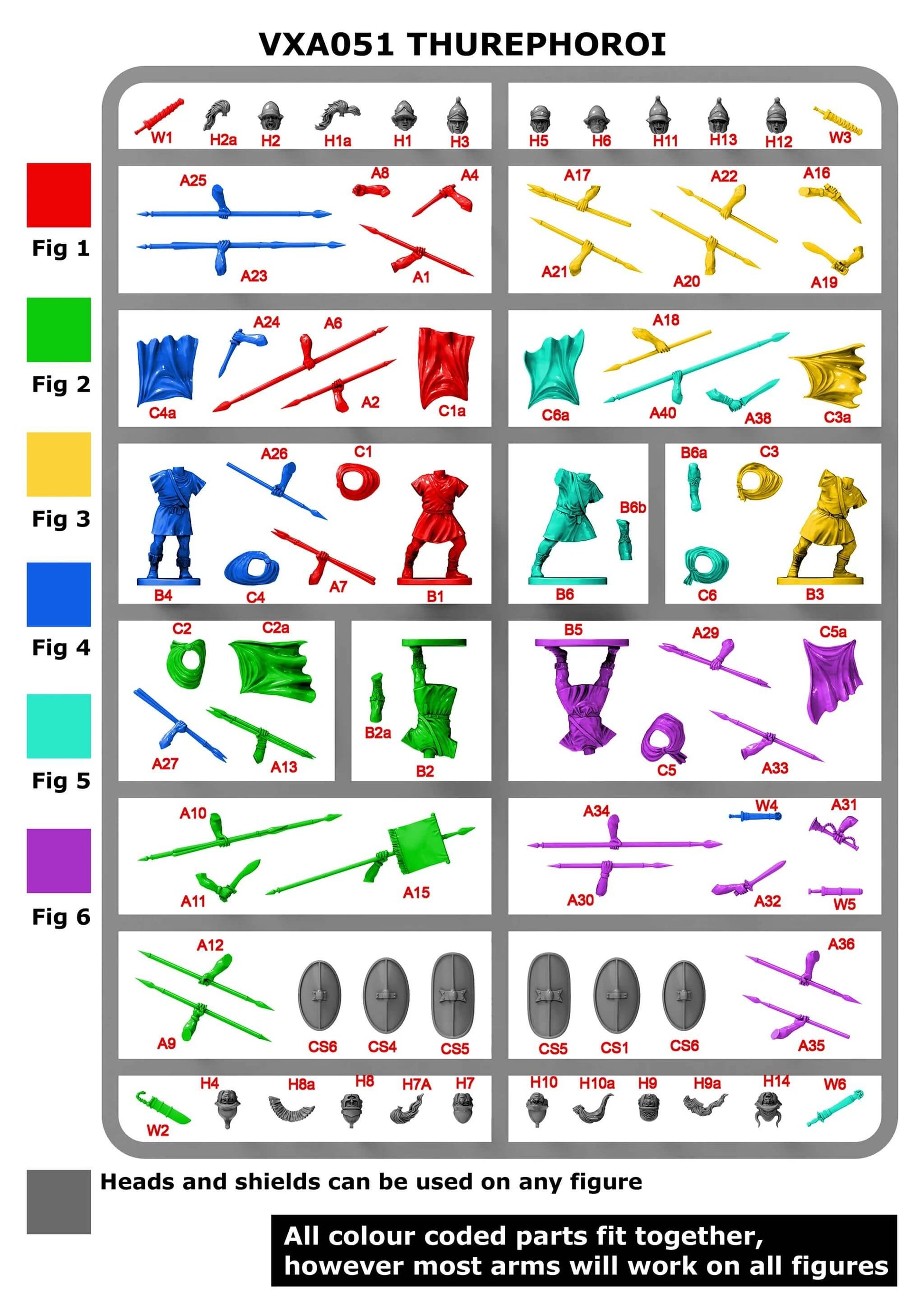 There are 6 Long thrusting spear options held in the left shield hand, enough for all figures in the set. If you do want to arm your Thurephoroi with thrusting spears in the right hand you can use them from the Greek hoplite set which has plenty of extras.