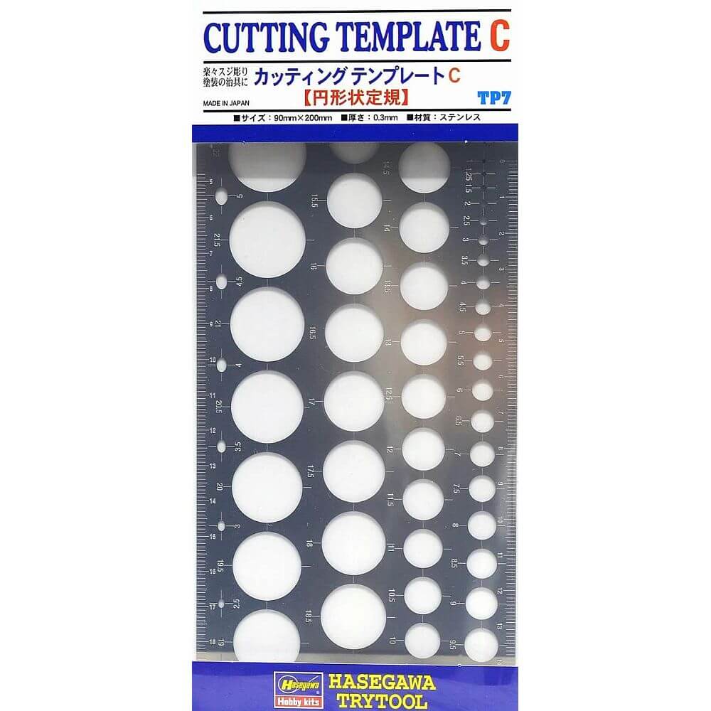 This template is precisely machined from high-hardness, 0.3mm thick stainless steel. It is designed to be used as a ruler for marking needles and blades. The circle shapes range in diameter from 1mm to 22mm in 0.5mm increments, with several additional size and shape variations.
