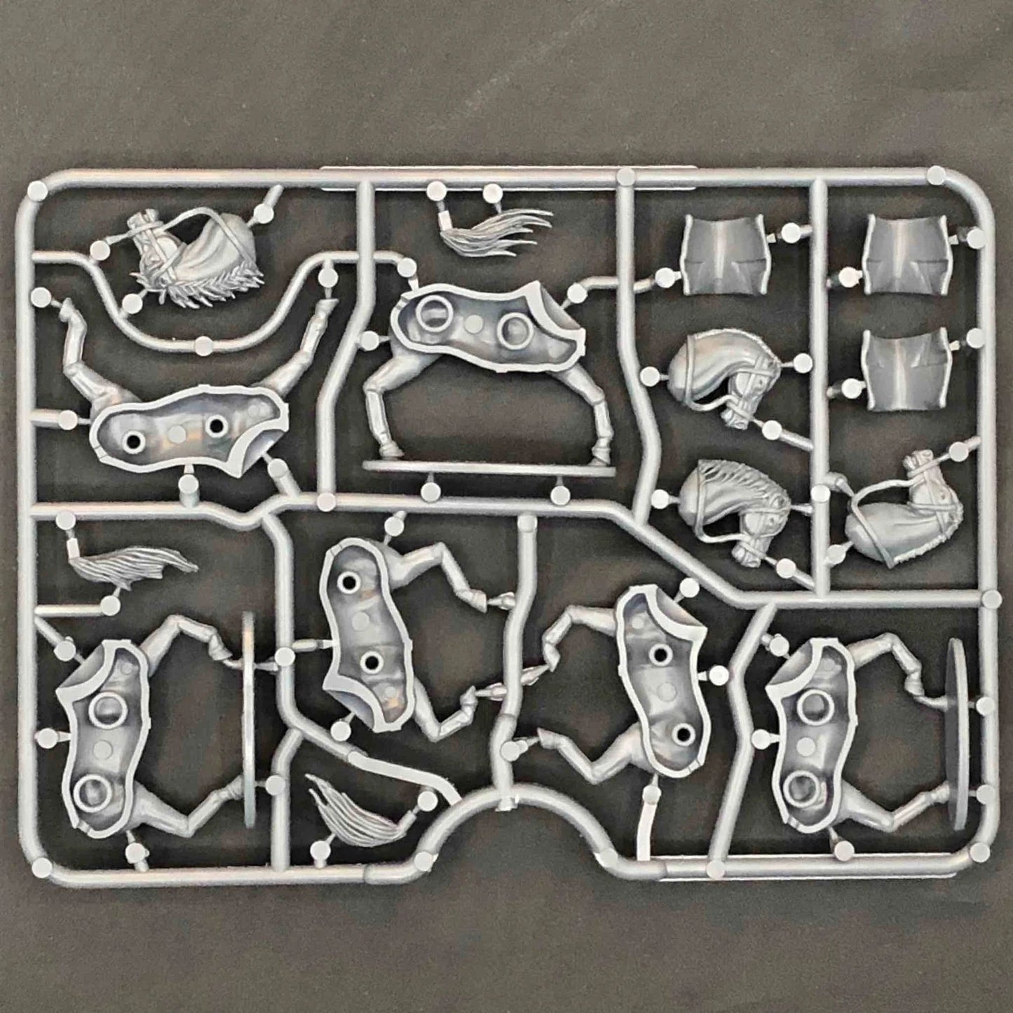 Single sprue includes six horse halves, four heads, three tails, and three saddle blankets.